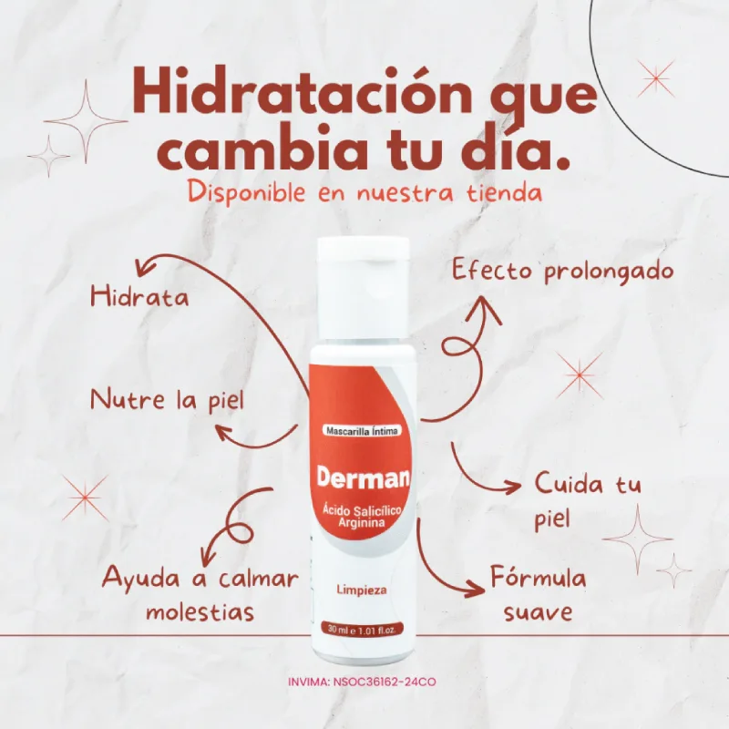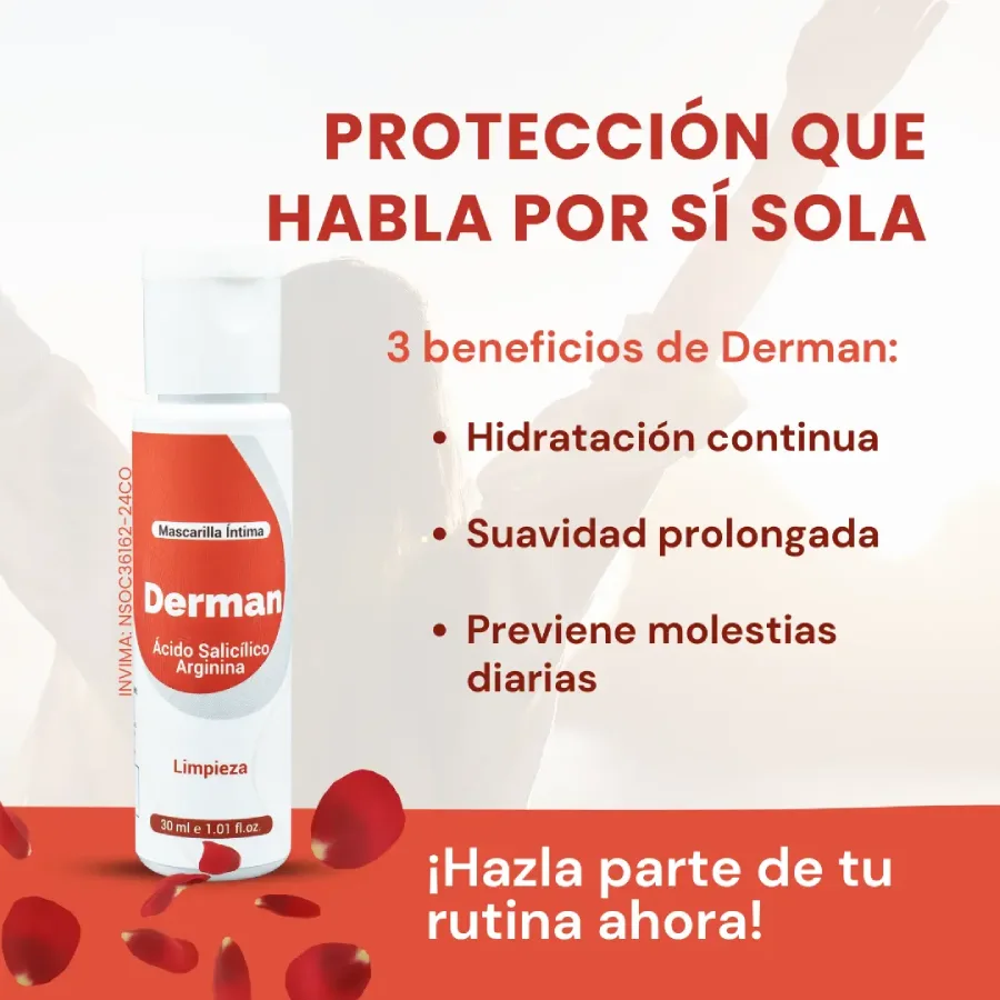Derman es una crema íntima diseñada para hidratar, suavizar y proteger la piel de la zona genital femenina y masculina. Su fórmula dermatológica alivia resequedad, irritación, picazón y molestias provocadas por fricción, depilación o ropa ajustada. Ideal para piel sensible y para mantener la zona íntima cómoda, flexible y saludable.