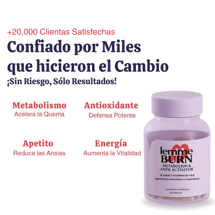Lemme Burn™ Woman es un suplemento alimenticio para mujeres diseñado para apoyar el metabolismo, la quema de grasa y los niveles de energía de forma natural. Su fórmula contiene extracto de té verde, vitaminas del complejo B y Actiponin®, ayudando a complementar un estilo de vida activo y saludable.