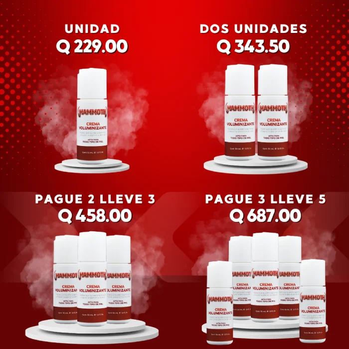 MAMMOTH es una fórmula avanzada diseñada para aumentar el volumen y la firmeza de diferentes áreas del cuerpo como glúteos, senos y zona íntima masculina, brindando resultados seguros, naturales y progresivos. Su combinación de ingredientes activos ayuda a mejorar la apariencia, tonificar la piel y elevar la confianza de forma no invasiva.