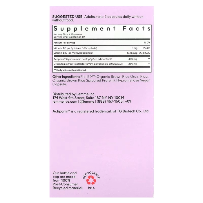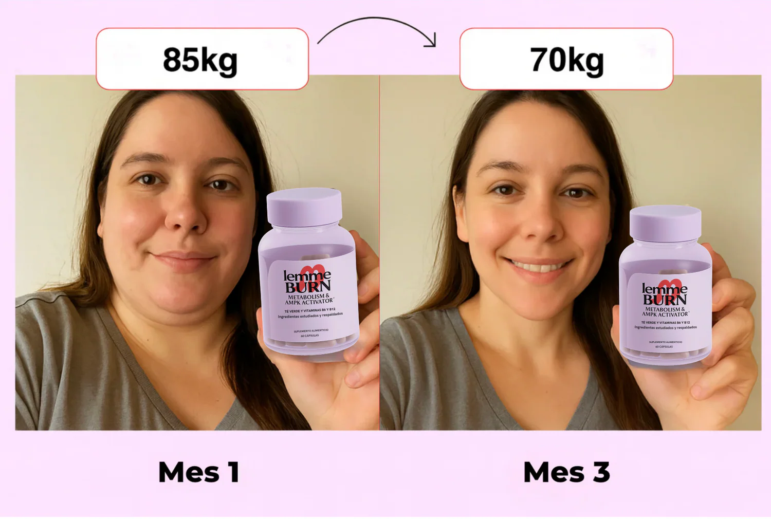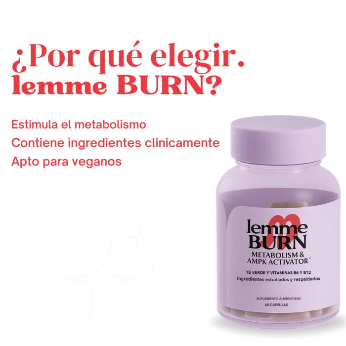 Lemme Burn™ Woman es un suplemento alimenticio para mujeres diseñado para apoyar el metabolismo, la quema de grasa y los niveles de energía de forma natural. Su fórmula contiene extracto de té verde, vitaminas del complejo B y Actiponin®, ayudando a complementar un estilo de vida activo y saludable.