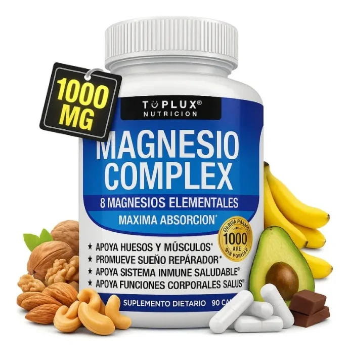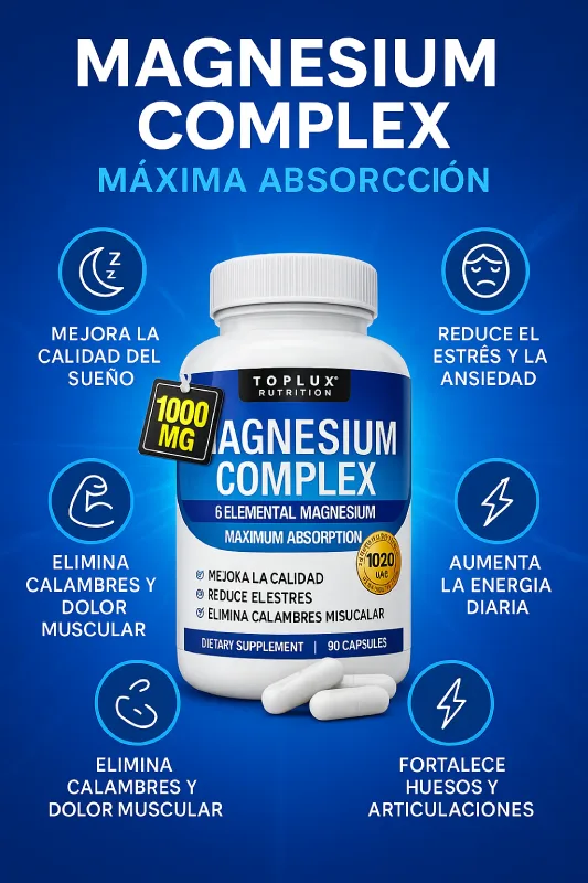 Magnesium Complex es un suplemento alimenticio formulado para apoyar múltiples funciones esenciales del cuerpo, especialmente la salud muscular, el sistema nervioso y la calidad del descanso.